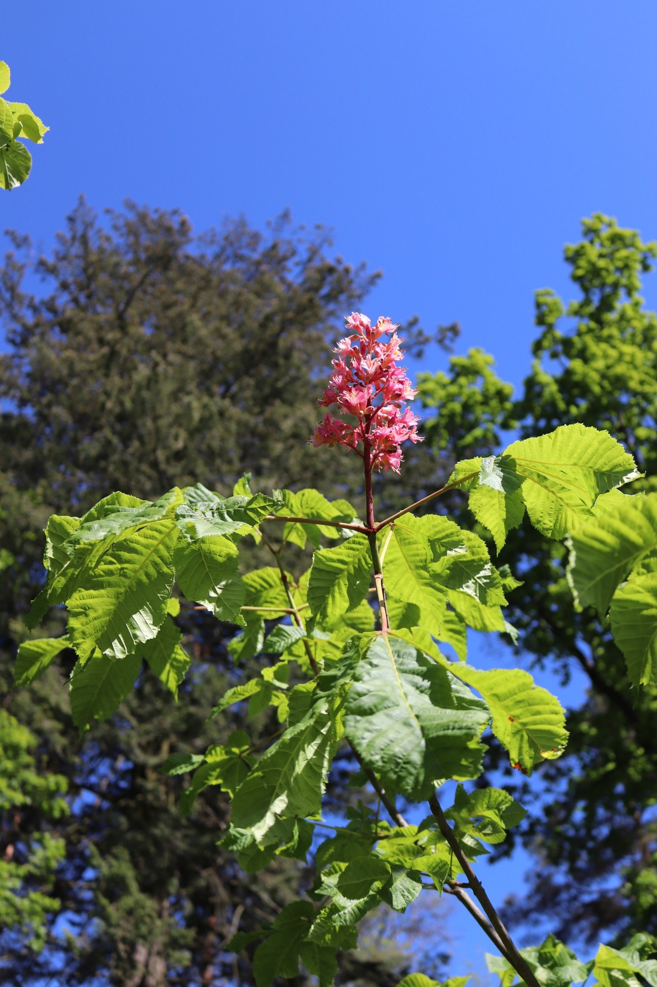 Aesculus × carnea - jírovec pleťový - květenství a listy
