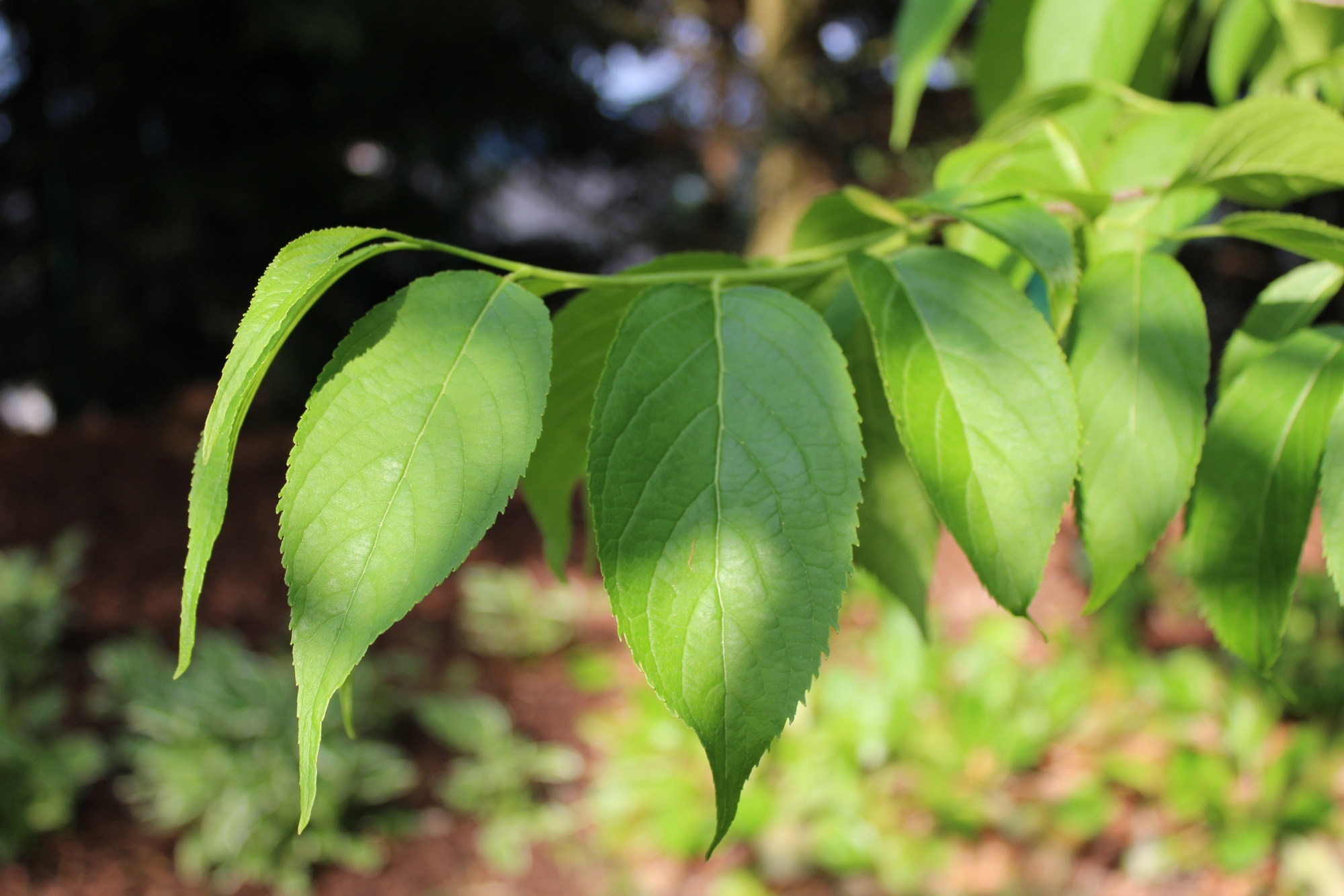 Eucommia ulmoides - gumojilm jilmovitý - jarní listy.jpg